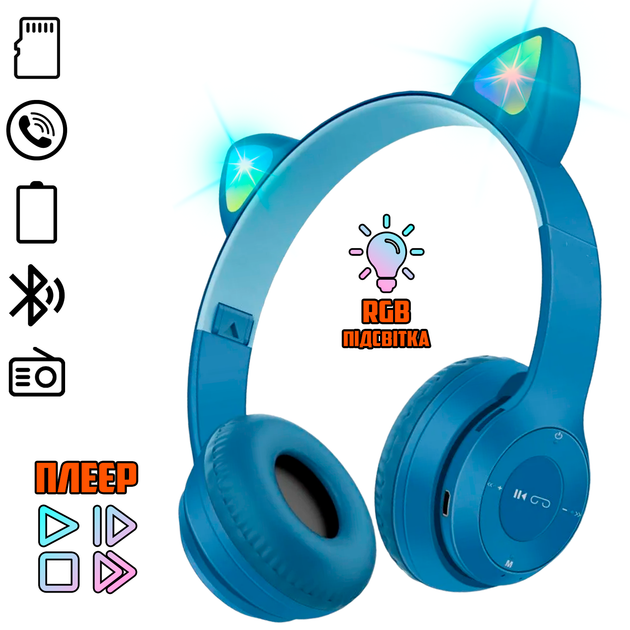 Бездротові Bluetooth навушники для дітей дитячі AKS-28 з котячими вушками, що світяться, LED RGB підсвічуванням, Blue
