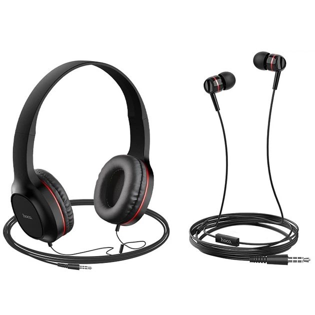 Комплект дротяних навушників накладні + вакуумні Hoco W24 Чорні з червоним