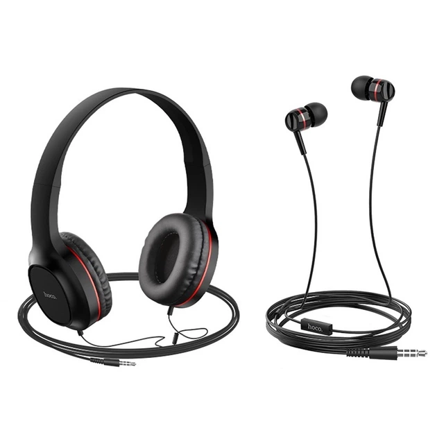 Комплект провідних навушників 2 в 1 накладні з оголов'ям + вакуумні Hoco W24 Чорні з червоним