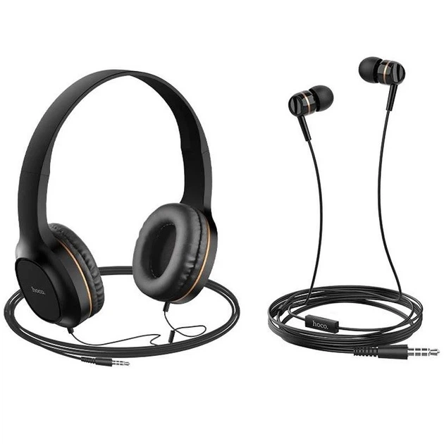 Комплект провідних навушників 2 в 1 накладні з оголов'ям + вакуумні Hoco W24 Чорні із золотим