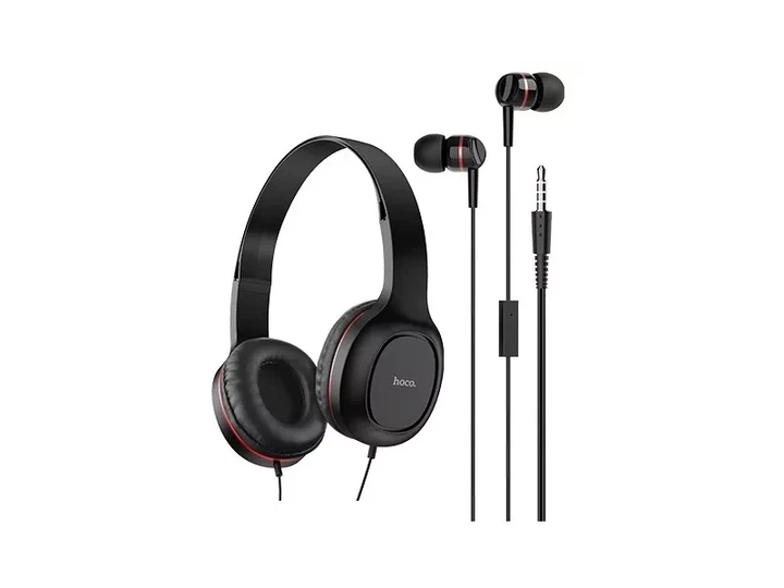 Комплект провідних навушників накладні та вакуумні Hoco W24 105/93 дБ 30/10 мВт Чорні з червоним