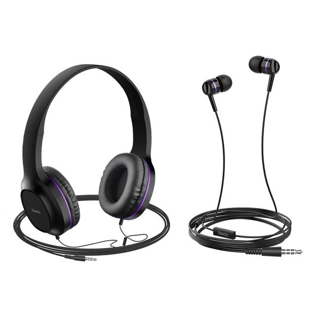 Комплект провідних навушників накладні та вакуумні Hoco W24 105dB / 93dB Чорні з фіолетовим