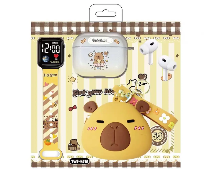 Подарунковий комплект бездротові навушники Bluetooth з зарядним кейсом годинником брелоком для дітей хлопчиків дівчаток (481