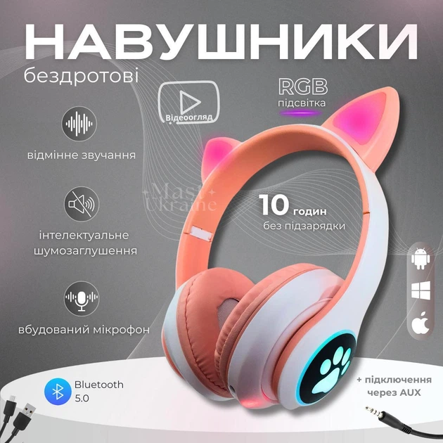 Навушники Bluetooth з котячими вушками Cat бездротові накладні, акумуляторні навушники з RGB підсвічуванням та вбудованим мі
