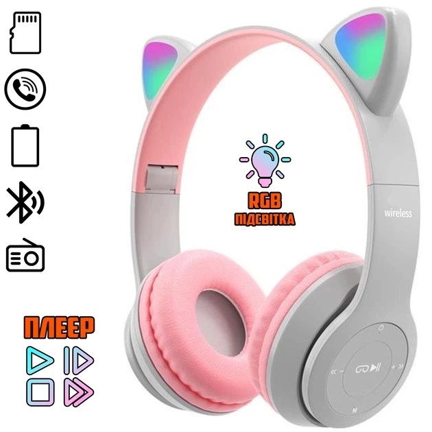 Бездротові Bluetooth навушники з котячими вушками P47M з мікрофоном FM радіо і LED підсвічуванням (Сірий)