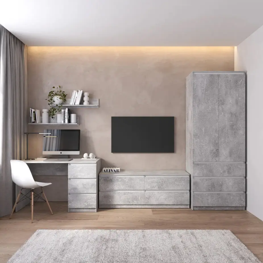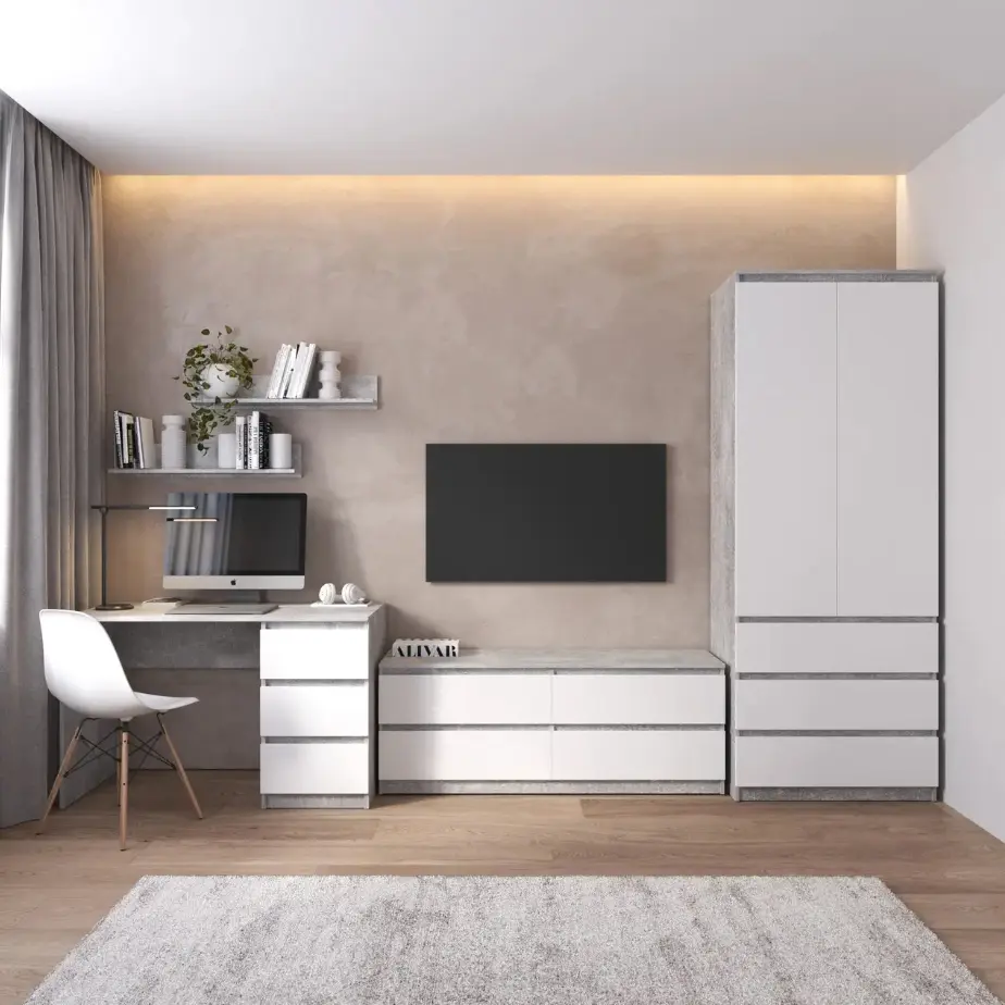 Комплект меблів у вітальню VAYS шафа R-9, тумба R-6, стіл R-1, полиці М-22, бетон-білий фасад