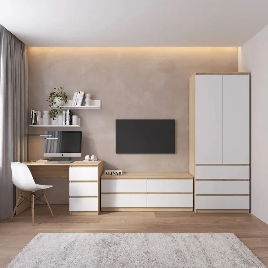 Комплект меблів у вітальню VAYS шафа R-9, тумба R-6, стіл R-1, полиці М-22, дуб сонома-білий фасад