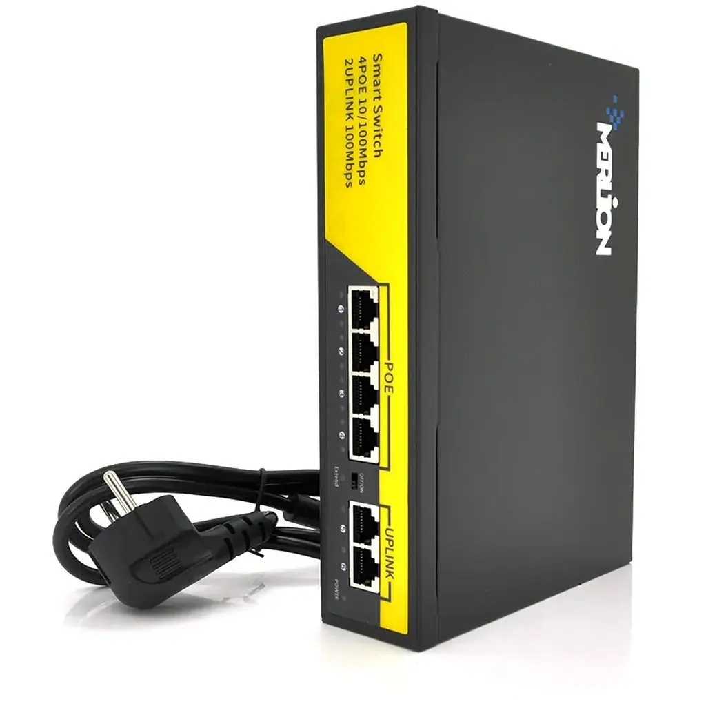POE комутатор Merlion 4 POE 10/100+2 RJ45 10/100+вбудований блок живлення 52V 1.38A Y-13196