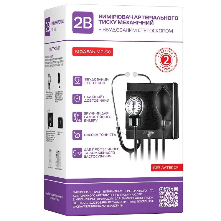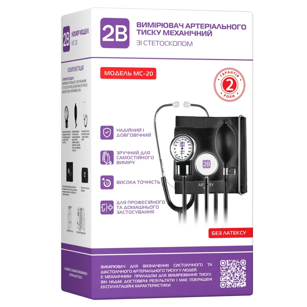 Тонометр механічний зі стетоскопом 2В МС-60: Вимірник артеріального тиску механічний 2B MC-20 зі стетоскопом виготовлений із надійних матеріалів високої якості, пройшов клінічні випробування, має високу точність вимірювань та відповідає європейським та українським стандартам. Розроблений з урахуванням потреби професіоналів, має відмінні експлуатаційні характеристики та