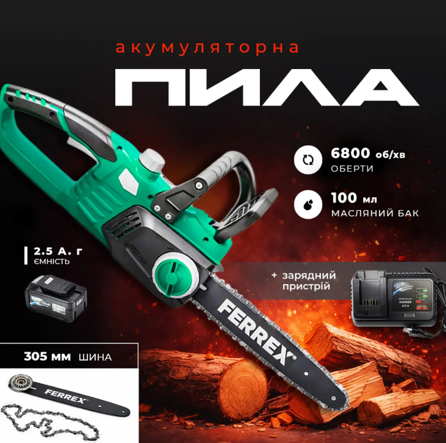 Акумуляторна ланцюгова пила Ferrex 40 В з безщітковим двигуном, акумуляторна, з зарядним пристроєм