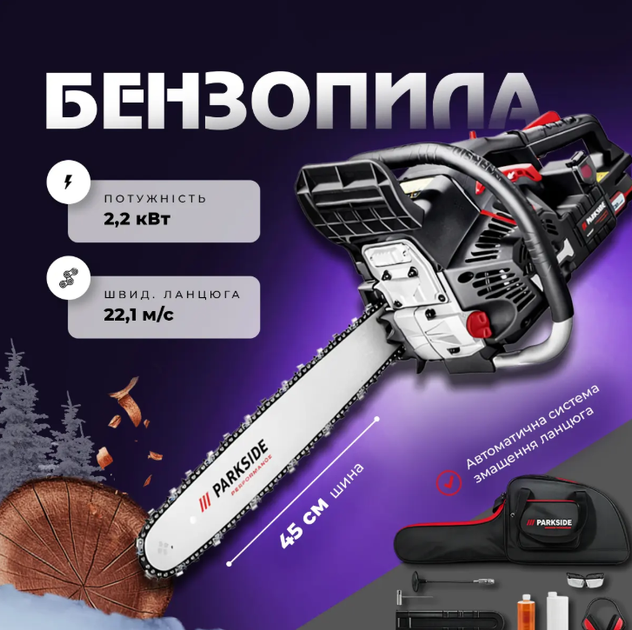 Бензопила Parkside з електростартером 2,2 кВт, шина 45 см, подвійний запуск