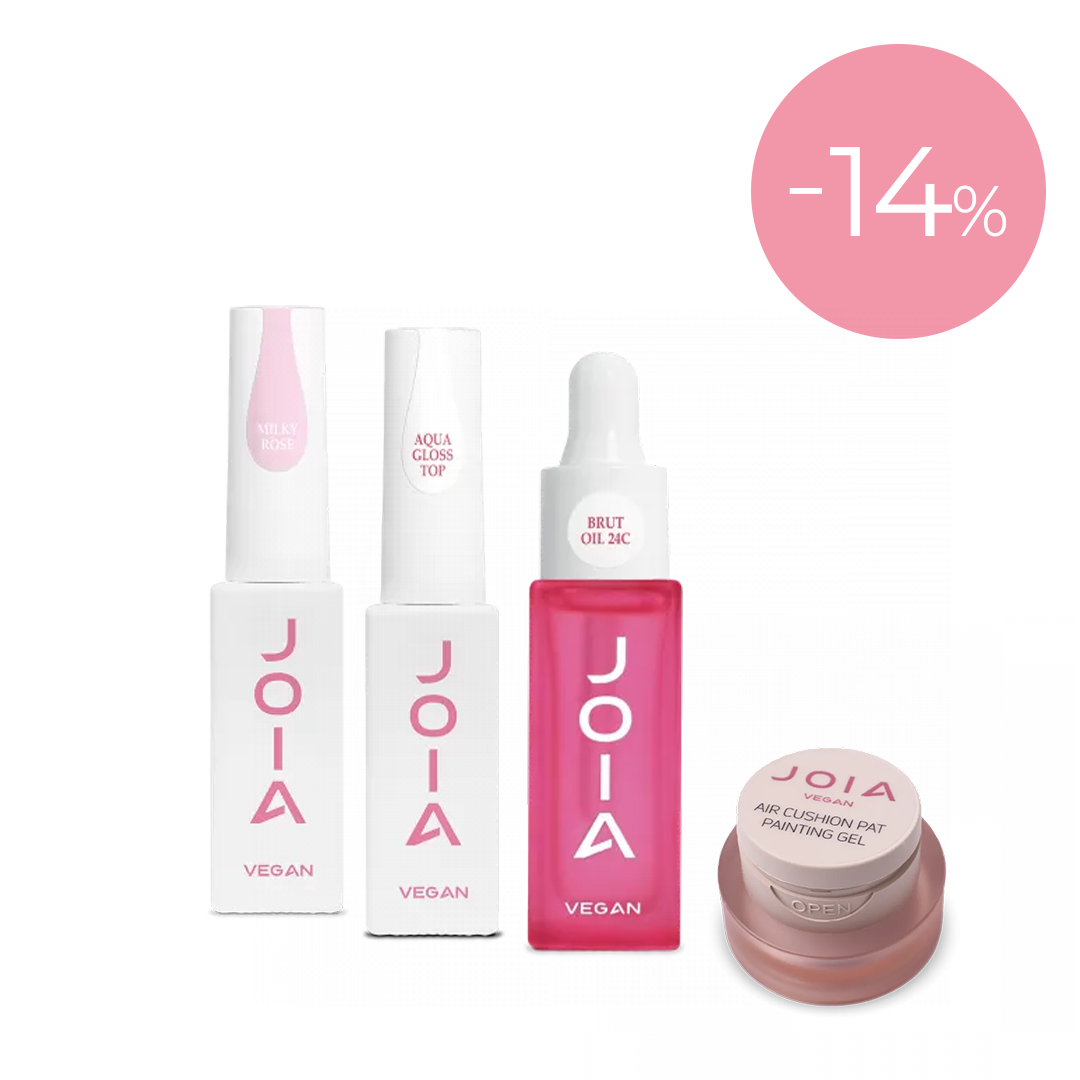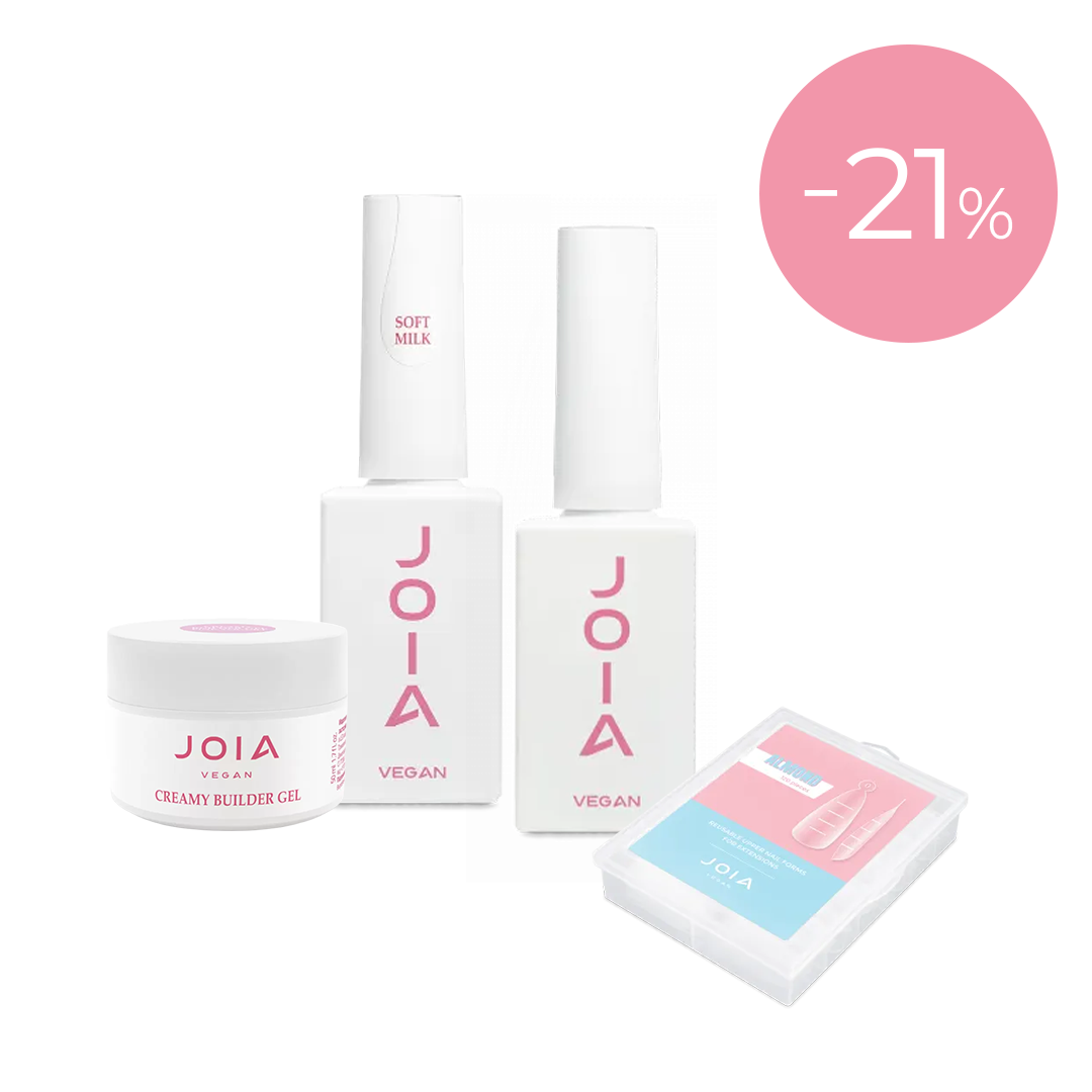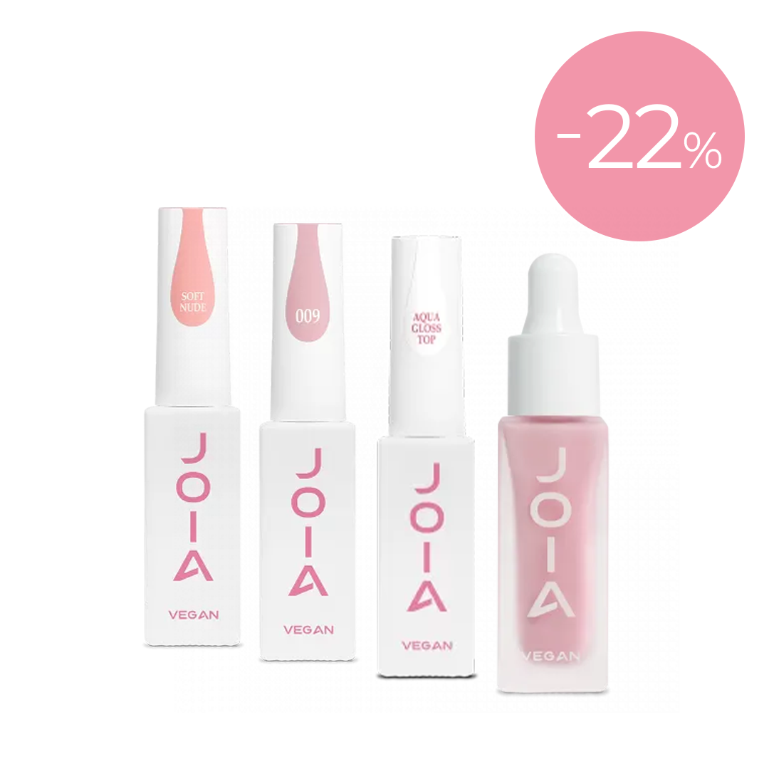 й відтінок гелевої системи. Такий колір асоціюється з найпоетичнішим образом кохання. Його особливий та пристрасний характер чудово римуватиметься з іншими матеріалами у французькому манікюрі та різноманітних дизайнах. UV/LED Creamy Builder JOIA vegan, Crystal Clear, 15 мл – бездоганний прозорий гель, про який Ви мріяли. Для створення архітектури під покриття гель-лаком, для технік акваріумного моделювання або для зміцнення нігтів в стилі “натуральні нігті без покриття”. Чистота кришталю заворожує та надихає, експериментуйте! UV/LED Latex base JOIA vegan, 8 мл – універсальне базове покриття. Ця база відмінно вирівнює поверхню та приховує недоліки нігтьової пластини. Продукт має еластичну, комфортну текстуру, яка легко розподіляється рівномірним шаром. Не створює зайвого об’єму, а також запобігає передчасній появі сколів або розшарування. Каучукова база JOIA vegan підійде навіть для ламкої нігтьової пластини. Купуючи ці продукти у наборі, Ви гарантовано отримуєте спокусливі ПОДАРУНКИ – Nail Primer JOIA vegan, 8 мл та Nail Dryer JOIA vegan, 8 мл. Nail Primer JOIA vegan, 8 мл – низькокислотний праймер стане справжньою знахідкою для створення стійкого манікюру. Він забезпечує стійке зчеплення між шарами (натуральним нігтем та декоративним покриттям). Ніяких сколів чи передчасного розшарування! Засіб не порушує pH нігтьової пластини, а також має антисептичні властивості. Nail Dryer JOIA vegan, 8 мл – дегідратор для нігтів, який допоможе створити ідеальне покриття. Багатофункціональний засіб не тільки знежирює та очищує пластину, але й прибирає зайву вологу, яка може зіпсувати манікюр! Крім цього, він покращує зчеплення між нігтьовою пластиною та декоративним матеріалом. Порадуйте себе ефективними та якісними продуктами JOIA vegan, отримуйте приємні подарунки та насолоджуйтесь красивим манікюром без кордонів та заборон прямо зараз!