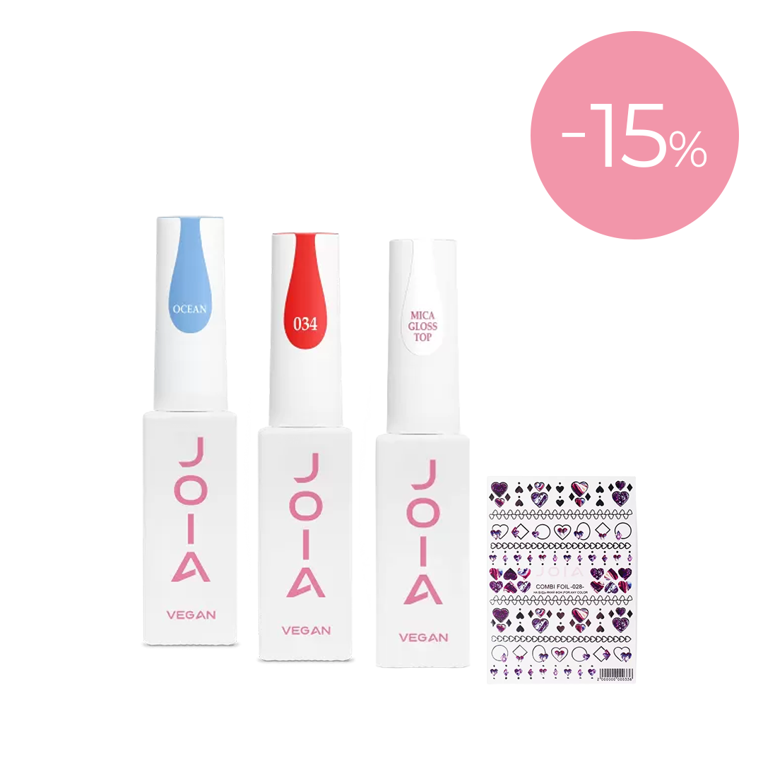 Набір для доньки "Young Glow Vibes" Вигода 15% Грайливий комплект для молодого образу та перших стильних експериментів. Легкий, сучасний і трендовий – для тих, хто любить колір, блиск і трохи декору. Ідеальний варіант, щоб створити акуратний манікюр із характером: ніжна база, яскравий відтінок, фініш із настроєм і стильний акцент у деталях. Колір + ефекти + декор = весело і модно. Чому набір – класний подарунок: вигідніше, ніж купувати окремо поєднання ніжності та яскравості можливість змінювати образ без складних технік трендовий результат навіть для початківців усе для стильного манікюру в одному сеті Набір включає: Камуфлюючу базу BB cream base Ocean, JOIA vegan, 8 мл – відтінок спокійного, теплого, доброзичливого океану, який окутує своїми ніжними хвилями. Гель-лак червоний JOIA vegan 034 – морквяно-червоний відтінок важко не запам’ятати, адже його яскравість видно неозброєним оком. Топ для гель-лаку Mica Gloss Top No Wipe, глянцевий, JOIA vegan, 8 мл – глянцевий фініш без липкого шару з розсипом частинок дрібної декоративної слюди. Слайдер JOIA vegan, Combi Foil 028 – фольговані слайдери для декорування покриття. Їх простота та елегантність перетворять манікюр на щось особливе. Це набір для тих, хто тільки формує свій стиль і не боїться проявляти себе. Трохи блиску, трохи гри – і манікюр уже говорить за тебе. Набір бере участь в акції 3+1 – 4-та найдешевша позиція йде у подарунок.