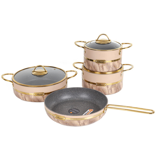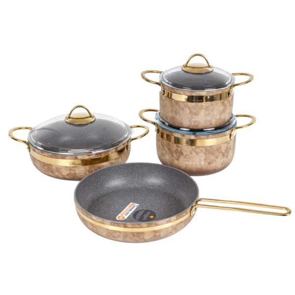 Тип внутрішнього покриття/Без покриття|Матеріал корпусу посуду/Алюміній|Особливості/Кришка з отвором для пари, Для газових плит, З кришкою|Зовнішнє покриття/Без покриття|Серія/Royal Stone|Номінальний об'єм, л/3 л, 2,5 л|Кількість предметів/7|Можливість миття в посудомийній машині/Ні|Гарантійний термін/3 роки|Діаметр/18 см, 20 см, 26 см|Сумісність з побутовою технікою/З газовими плитами, З електричними плитами|Колір виробника/Бежевий|Комплектація/Каструля - 18 см/2,5 л, Кришка скляна – 18 см, Кришка скляна – 20 см, Каструля - 20 см/3 л, Сотейник – 26 см, Сковорода – 26 см|Бренд/Brioni|Ручки/Алюмінієві|Країна виробництва/Туреччина