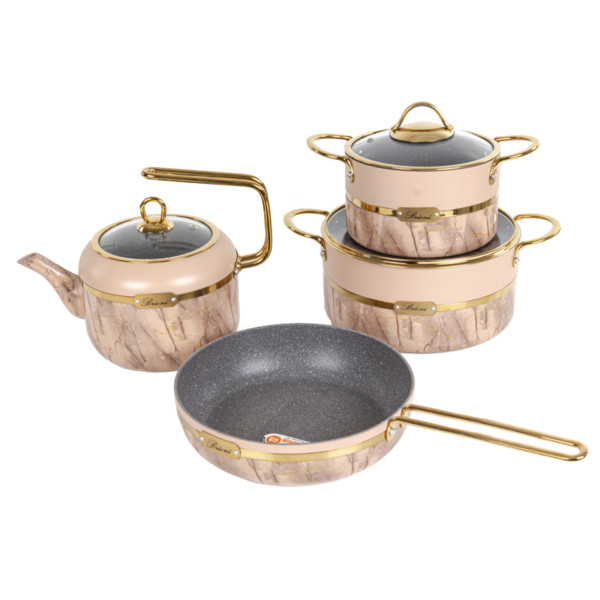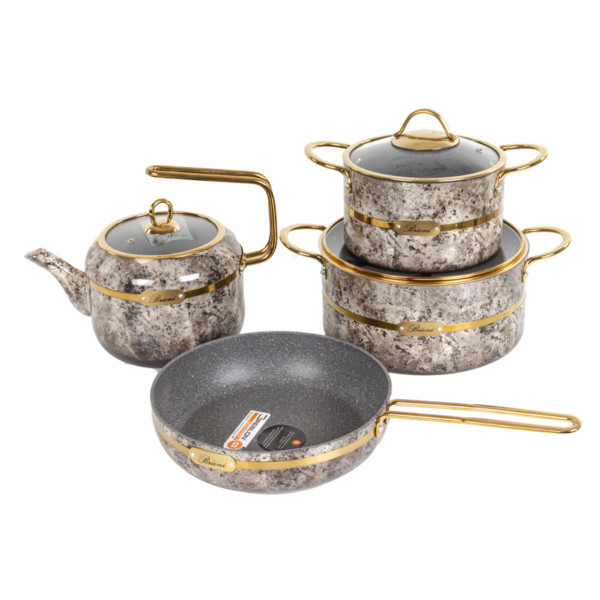 Тип внутрішнього покриття/Без покриття|Матеріал корпусу посуду/Алюміній|Особливості/Кришка з отвором для пари, Для газових плит, З кришкою|Зовнішнє покриття/Без покриття|Серія/Royal Stone|Номінальний об'єм, л/2,5 л, 5 л|Кількість предметів/6|Можливість миття в посудомийній машині/Ні|Гарантійний термін/3 роки|Діаметр/18 см, 24 см|Сумісність з побутовою технікою/З газовими плитами, З електричними плитами|Колір виробника/Бежевий|Комплектація/Каструля - 18 см/2,5 л, Кришка скляна – 18 см, Кришка скляна - 24 см, Каструля - 24 см/5 л, Сковорода – 24 см, Чайник|Бренд/Brioni|Ручки/Алюмінієві|Країна виробництва/Туреччина