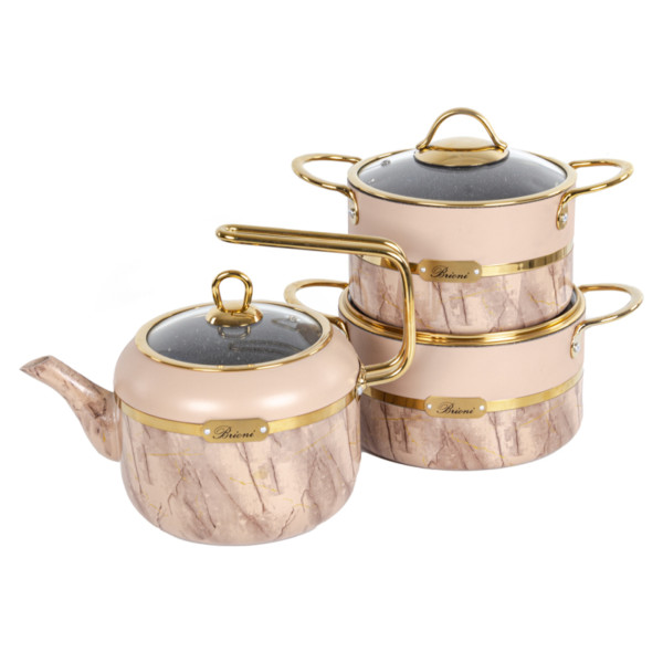 Тип внутрішнього покриття/Без покриття|Матеріал корпусу посуду/Алюміній|Особливості/Кришка з отвором для пари, Для газових плит, З кришкою|Зовнішнє покриття/Без покриття|Серія/Selection|Номінальний об'єм, л/2,1 л, 2,7 л|Кількість предметів/5|Можливість миття в посудомийній машині/Ні|Гарантійний термін/3 роки|Діаметр/18 см, 20 см|Сумісність з побутовою технікою/З газовими плитами, З електричними плитами|Колір виробника/Бежевий|Комплектація/Каструля - 18 см/2,1 л, Каструля - 20 см/2,7 л, Кришка скляна – 18 см, Кришка скляна – 20 см, Чайник|Бренд/Brioni|Ручки/Алюмінієві|Країна виробництва/Туреччина
