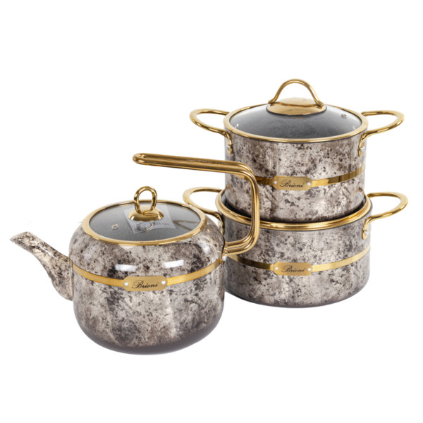 Тип внутрішнього покриття/Без покриття|Матеріал корпусу посуду/Алюміній|Особливості/Кришка з отвором для пари, Для газових плит, З кришкою|Зовнішнє покриття/Без покриття|Серія/Selection|Номінальний об'єм, л/2,1 л, 4 л|Кількість предметів/6|Можливість миття в посудомийній машині/Ні|Гарантійний термін/3 роки|Діаметр/18 см, 24 см|Сумісність з побутовою технікою/З газовими плитами, З електричними плитами|Колір виробника/Сірий|Комплектація/Каструля - 18 см/2,1 л, Кришка скляна – 18 см, Кришка скляна - 24 см, Сковорода – 24 см, Кастрюля - 24 см/4 л, Чайник|Бренд/Brioni|Ручки/Алюмінієві|Країна виробництва/Туреччина