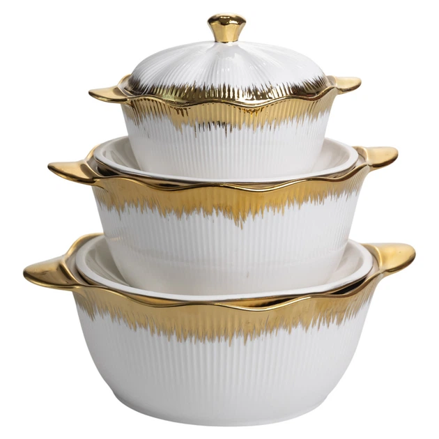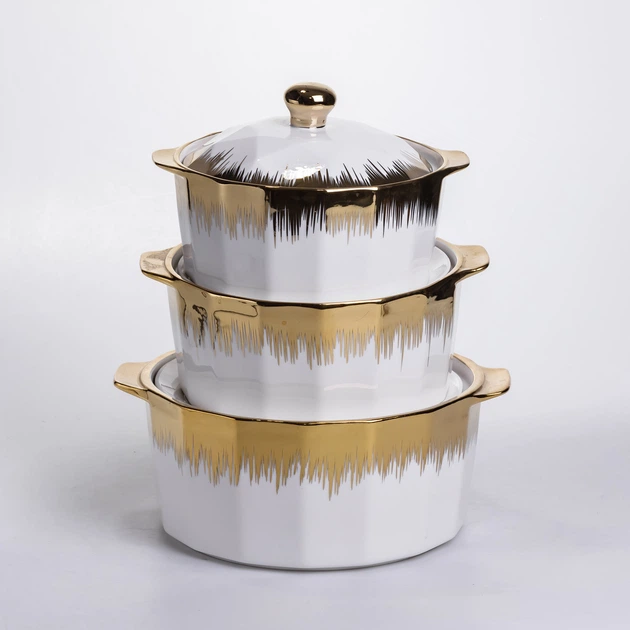 Набір супниць порцелянових 3 (шт) 1.5/2/3 (л) каструлі бульйонниці з кришкою та ручками для дому та ресторану з позолотою
