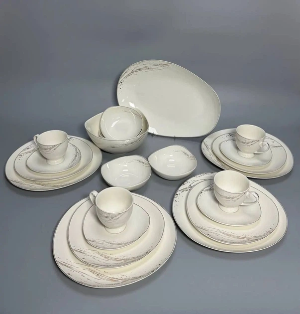 Цей чайно-столовий сервіз виготовлений з порцеляни. Матеріал відрізняється міцністю, механічною і термічною стійкістю, стійкістю до різних кислот. Фарфор виготовляють шляхом високотемпературного обпалення суміші каоліну, кварцу, польового шпату і глини. Витончена форма кожного окремого елемента підкреслюється відсутністю будь-якого малюнка, крім тонкої золотистої