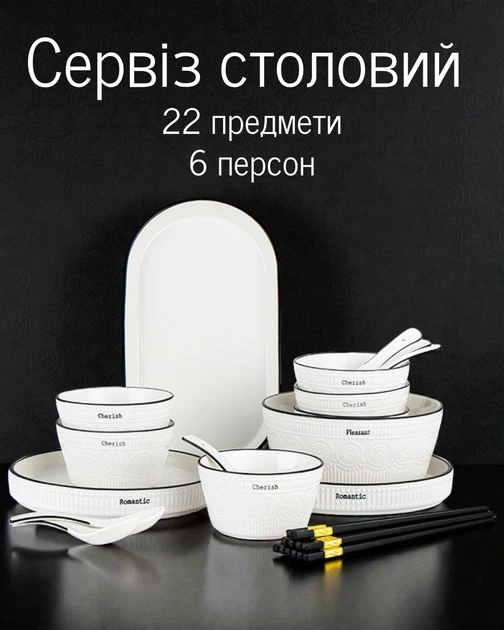 Фарфоровий сервіз столовий на 6 персон, набір тарілок для сервірування 22 предметів, білий колір