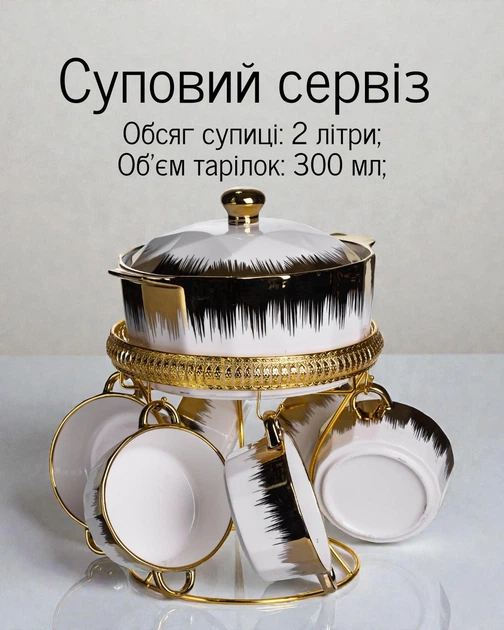 Порцеляновий суповий сервіз з супницею 2 (л) та тарілками на підставці 400 (мл) / набір для подачі супу з золотими та чорним
