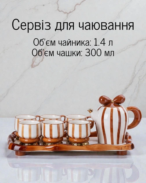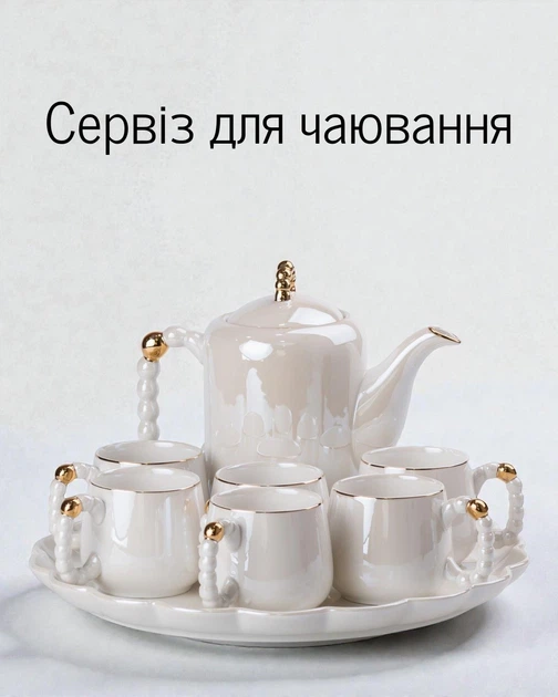 Чайно-столовий сервіз на шість персон виготовлений з порцеляни. Цей матеріал відрізняється міцністю, механічною і термічною стійкістю, стійкістю до різних кислот. Фарфор виготовляють шляхом високотемпературного обпалення суміші каоліну, кварцу, польового шпату і глини. Сервіз з бароковими округлими формами прикрашений вишуканим орнаментом золотистого кольору. Незвичайним