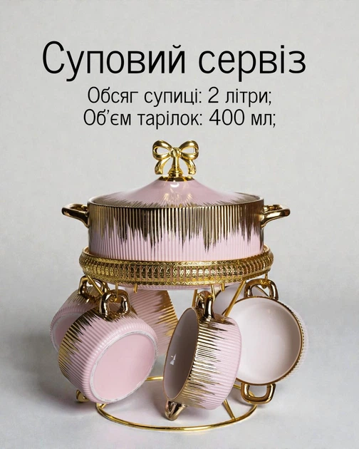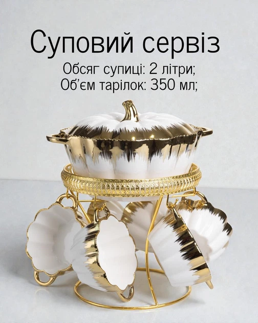 Порцеляновий суповий сервіз із супницею та тарілками на підставці / набір для подачі супу з золотими акцентами
