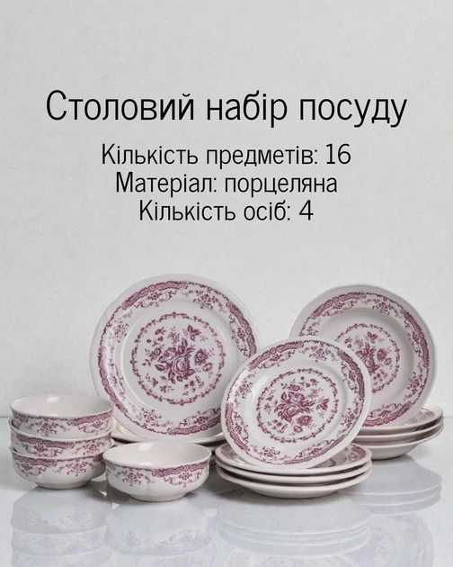 Чайно-столовий сервіз на шість персон виконаний з порцеляни. Цей матеріал відрізняється міцністю, механічною і термічною стійкістю, стійкістю до різних кислот. Фарфор виготовляють шляхом високотемпературного обпалення суміші каоліну, кварцу, польового шпату і глини. Вишуканий сервіз в класичному стилі прикрашений квітковим натюрмортом з червоних і білих троянд. Посуд з таким