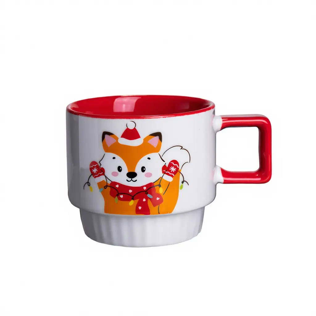 Новорічна порцелянова чашка для чаю та кави з Новорічним лисом 400 мл Білий з червоним Yiwu FM-CS-50L