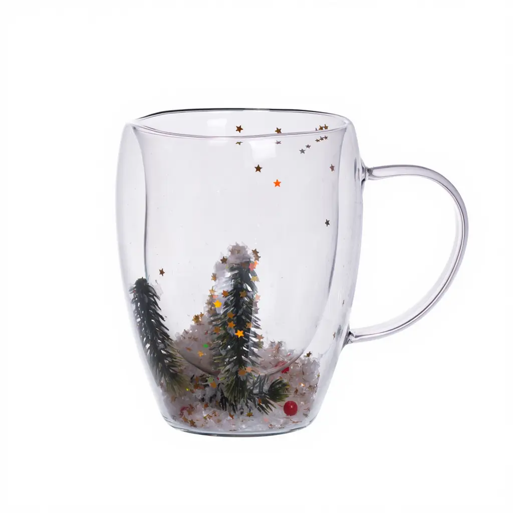 Чашка скляна з подвійними стенкаміс новорічним декором гілочка з ялинки 350 мл Yiwu 64486-44
