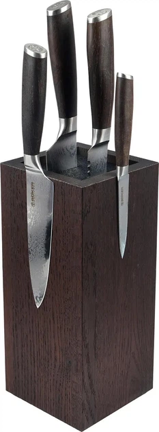 Країна походження бренду: Німеччина; Матеріал рукояті: дерево; Марка сталі: VG-10; Підставка: Матеріал леза: сталь; підставка; Ніж для хліба (см): 20; Ніж для очищення (см): 9; Кухарський (см): 15; для хліба; для очищення; кухарський; Предметів в наборі (шт.): 4