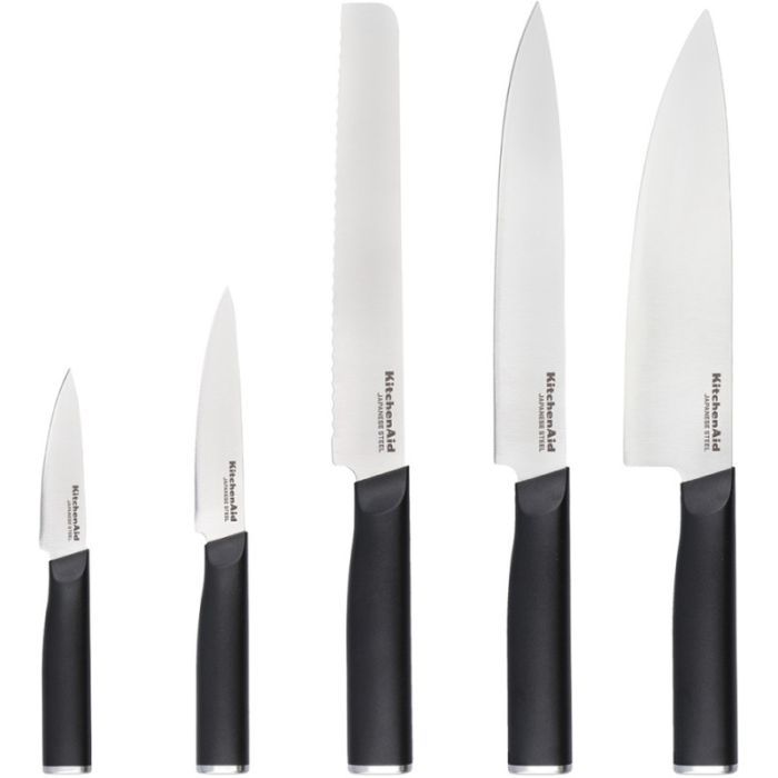 Набір ножів з підставкою KitchenAid Classic, 5 предметів (KE5PSTANOBG) Кухарський ніж 20 см (8 дюймів): для нарізки м'яса, овочів, фруктів. Ніж для хліба 20 см (8 дюймів): для легкого нарізання свіжого хліба без пошкодження корки. Ніж для нарізки 20 см (8 дюймів): ідеальний для нарізки великих шматків м'яса. Ніж 11,5 см (4½ дюйма): універсальний ніж для більш дрібних завдань. Ніж для чищення 9 см (3½ дюйма):