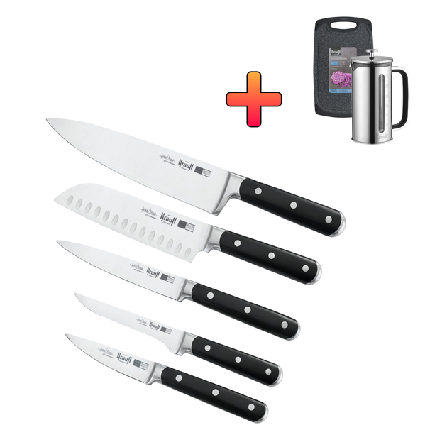 Набір ножів Prime Chef Krauff та Ніж сантоку 17,5см + ПОДАРУНКИ: Френч-пресc 1000мл та Дошка обробна пластикова SolideStein