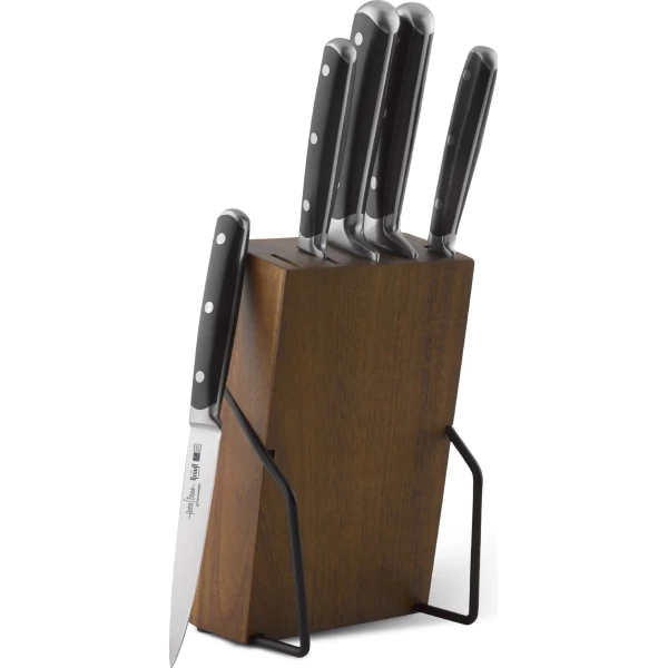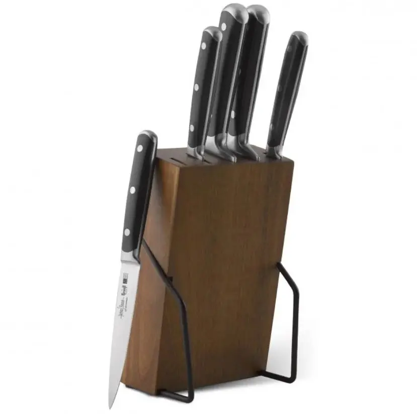 Країна походження бренду: Німеччина; Матеріал рукояті: сталь; Марка сталі: x40Cr13; Підставка: Матеріал леза: сталь; підставка; для хліба; розділювальний; для очищення; кухарський; універсальний; Предметів в наборі (шт.): 5