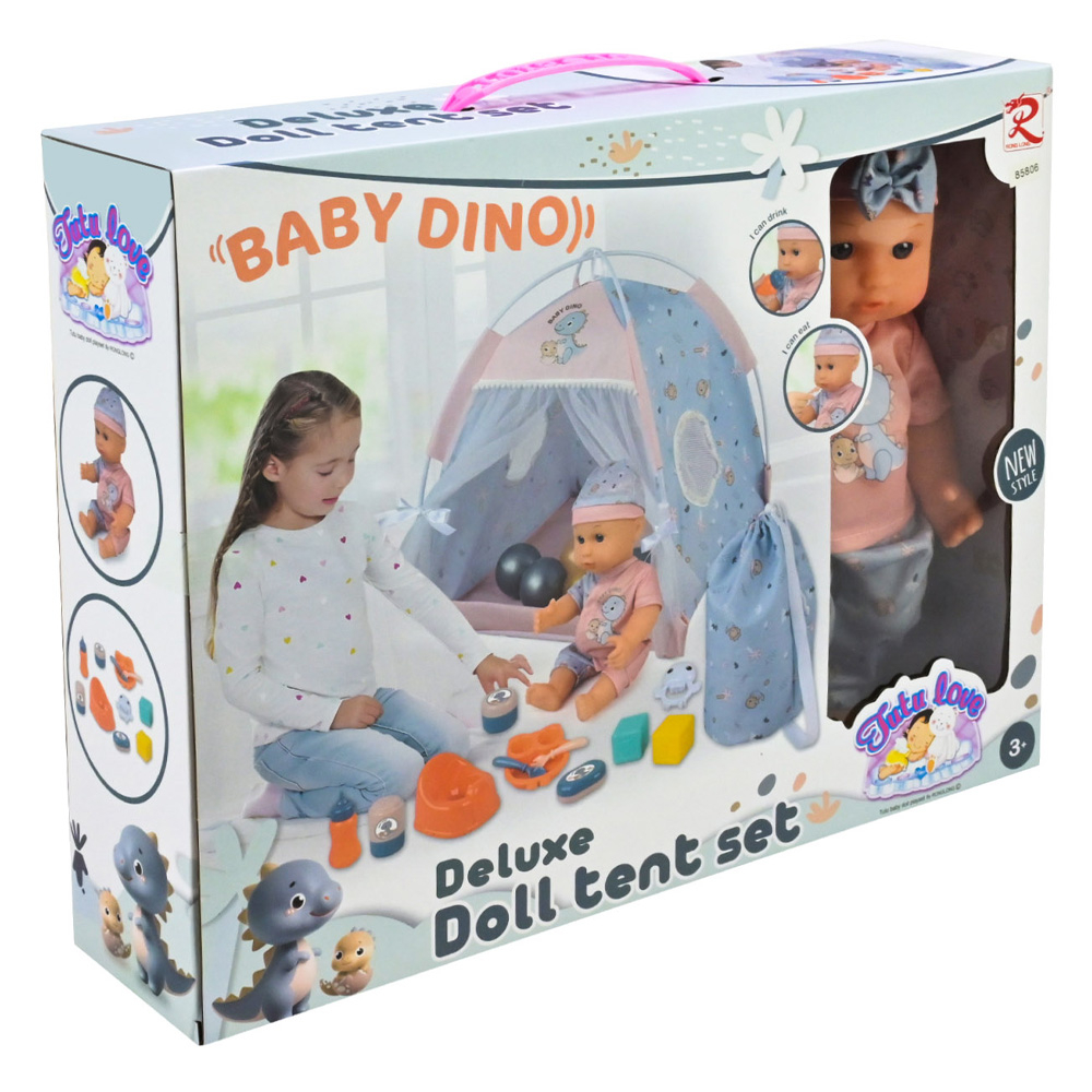 Зануртесь у чарівний світ уяви та веселощів! Цей ігровий набір з лялькою та різноманітними елементами і аксесуарами створений для відтворення справжньої гри “як у дорослих” — дитина може доглядати за пупсом, годувати його та вкладати спати. Цей набір є надзвичайно цінним для розвитку дитини і вчить її турботливості, комунікативним навичкам та уяві. Комплектація: Пупс в одязі; Сумочка для палатки; Палатка; Іграшкові кульки; Горщик, пляшка, тарілка з ложкою і виделкою та інші ігрові аксесуари. Інтерактив: Пупс може пити через пляшку, в яку потрібно налити воду. Гігієнічні навички у грі — садимо на горщик, лялька пісяє, що робить гру реалістичною.