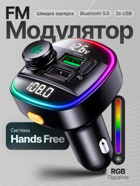 Автомобільний ФМ трансмітер FM модулятор з Bluetooth адаптер для автомобіля зі швидкою зарядкою підсвіткою мікрофоном блютуз
