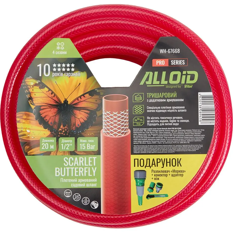 Шланг армований 3-х шаровий, "SCARLET BUTTERFLY" 1/2" 20 м + подарунок, серія Alloid Pro