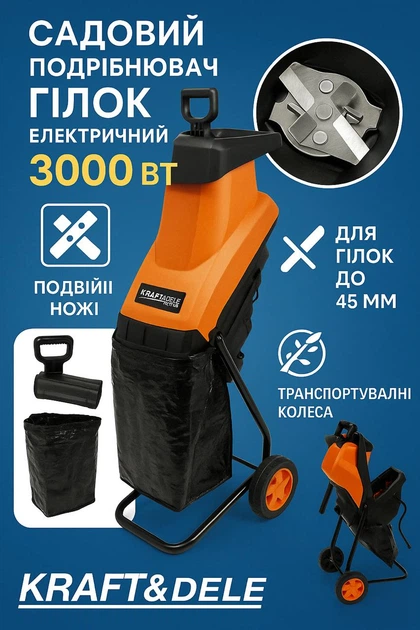 Садовий подрібнювач гілок 3000W Kraft&Dele KD5212 електричний для гілок до 45 мм
