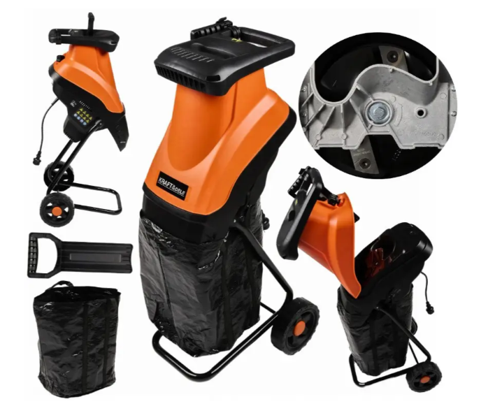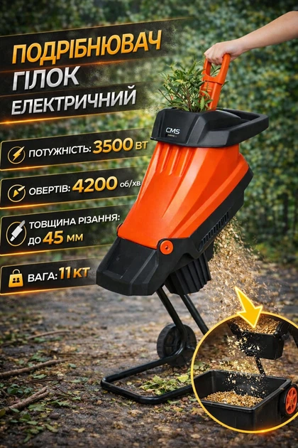 Садовий електричний подрібнювач 3500 Вт, ножовий механізм, діаметр гілок до 45 мм, 4200 об/хв, пересувний, з м’яким травозбі