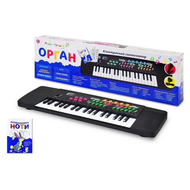 Іграшка музична Орган Shantou Jinxing Орган з мікрофоном буде відмінним подарунком для дітей від 5 років. На піаніно можна не тільки грати мелодії, а й записувати свої пісні за допомогою мікрофона. У наборі також є слова і ноти пісень, а також розмальовки. Синтезатор живиться від батарейок АА.