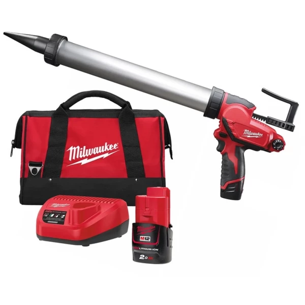 ливості, додаткові характеристики/ - Алюминиевая туба 400 мл - Усилие до 1780 Н - При отпускании кнопки, поршень отходит назад предотвращая нежелательное вытекание клеящих веществ - 6 ступенчатая предустановка скоростей - Индикатор уровня заряда - Универсальная аккумуляторная система: работает со всеми аккумуляторами MILWAUKEE M12 - В комплектацию входит: клеевой пистолет, аккумулятор, зарядное устройство, сумка для инструмента
