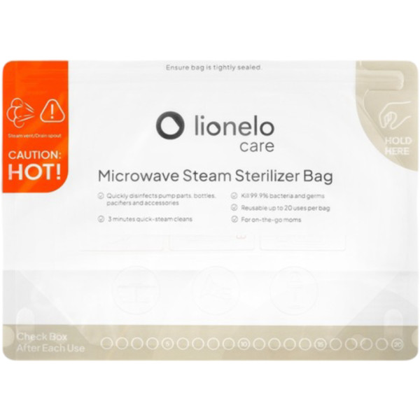 Батарейки в комплекті/Ні|Тип/Пакети для стерилізації|Батарейки/Ні|Формат/Пакет|Час стерилізації/1,5 хв|Кількість стерилізаций на одному заряді/20|Кількість пляшок для одночасної стерилізації/1|Функції/Стерилізація|Бренд/Lionelo|Комплектація/Пакети для стерилізації|Тип стерилізації/Мікрохвилі|Призначення/Для пляшечок|Джерело живлення/Ні