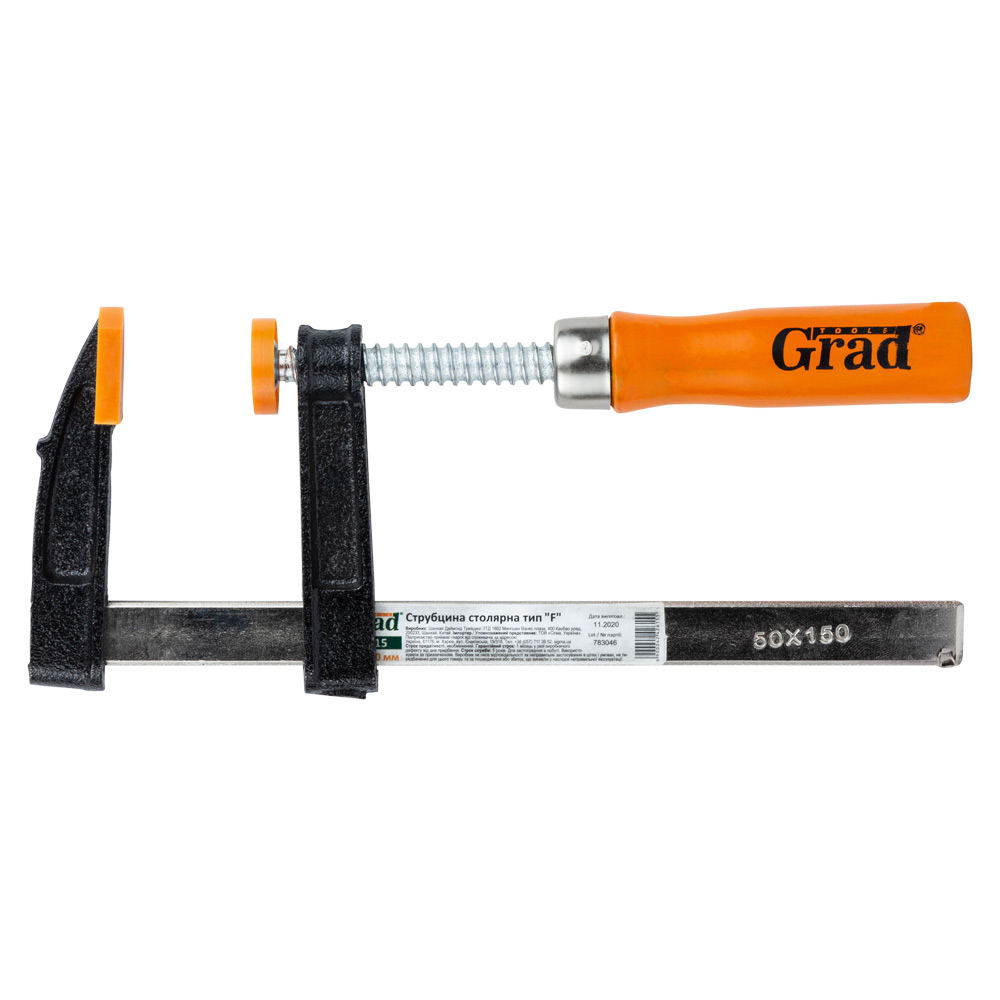 Колір: Помаранчевий, Чорний; Ширина: 5; Довжина: 15; Виробник: Grad; Вид струбцини: F-подібна; Країна виробника: Китай; Механізм затискання: Гвинтовий
