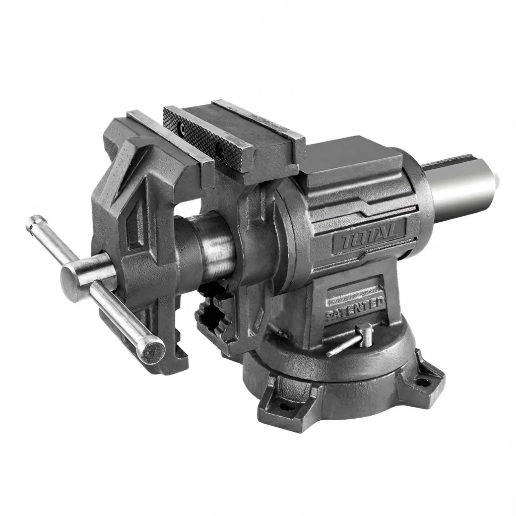 Слюсарні лещата з ковадлом TOTAL THTMF6156 служать для фіксації невеликих заготовок. Модель має функцію повороту для зручності використання. Корпус виконаний із чавуну високої міцності. Широке ковадло дозволяє проводити обробку молотком. Рельєфні сталеві губки забезпечують надійний затиск деталей. Максимальна сила затиску - 2000 кгс. Вага - 19.5 кг. - Довжина лещат: 125 мм