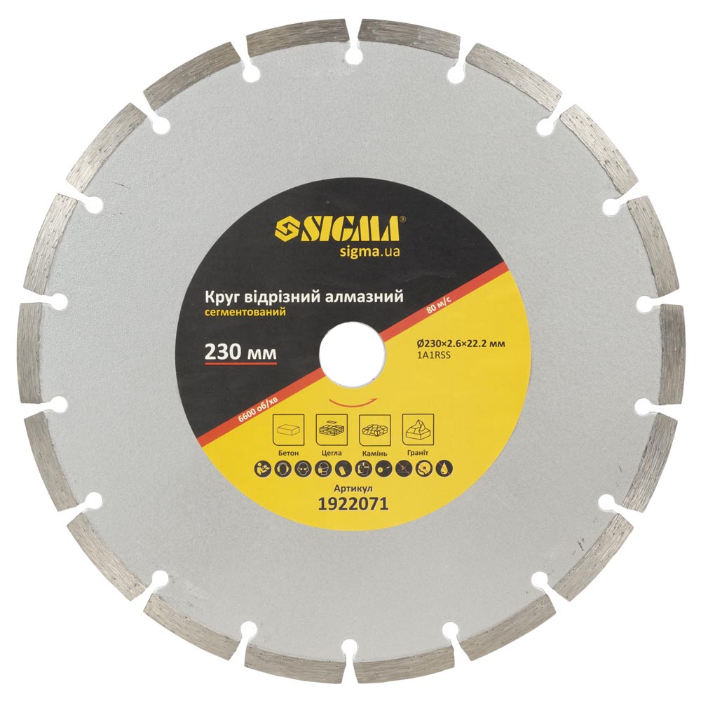 Колір: Хром; Виробник: Sigma; Тип диску: Сегментний; Призначення: Для каменю, Для бетону, Для цегли, Для граніту; Спосіб різання: Сухий; Країна виробника: Китай; Діаметр зовнішній: 230; Діаметр посадочний: 22.2