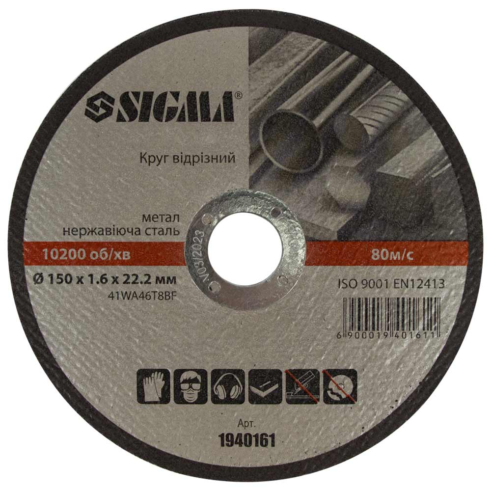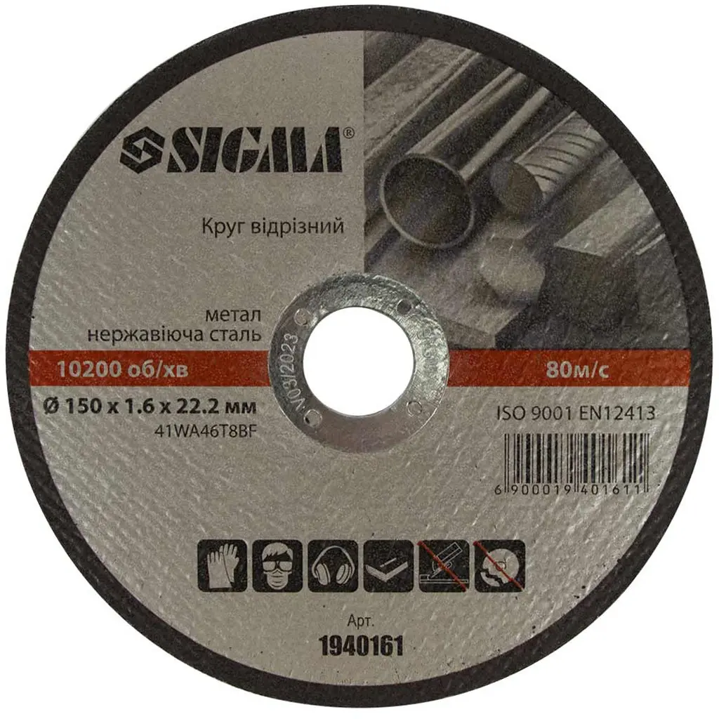 Круг відрізний по металу та нержавіючої сталі Sigma Ø150×1.6×22.2 мм 10200 об/хв (1940161)