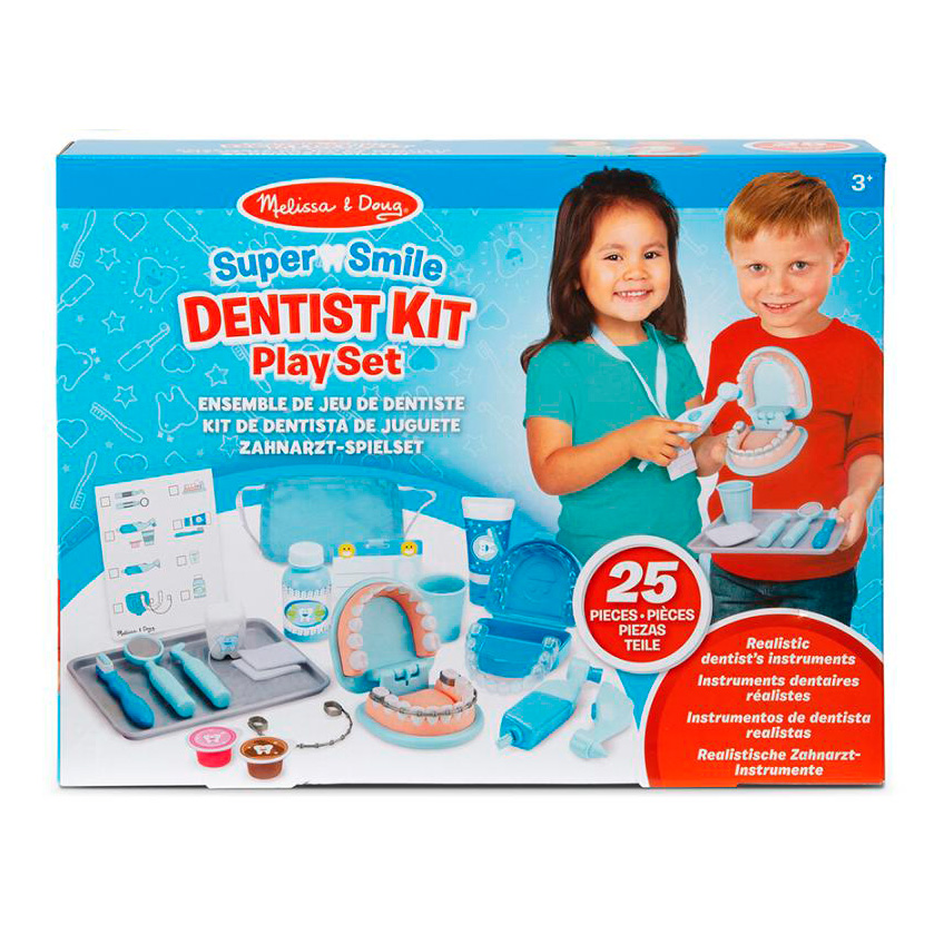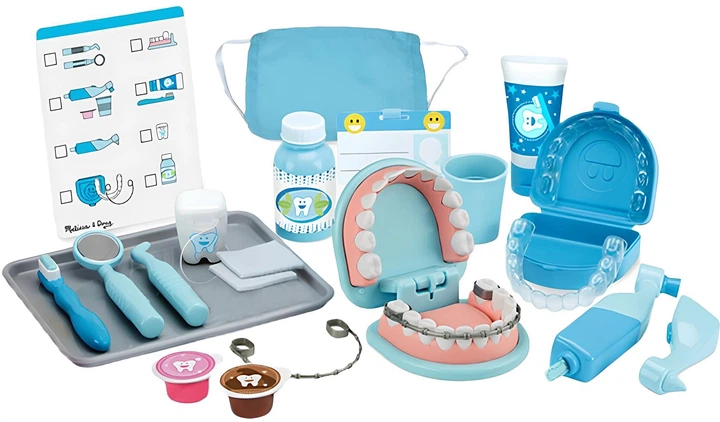 чгровий набір Melissa and Doug Стоматолог — це чудовий набір із 25 предметів, який дозволяє дітям перевтілитися у справжніх зубних лікарів. У комплекті — велика модель щелепи, яку можна чистити, «лікувати» від карієсу, а також приміряти до неї брекети та пластини. Маленькі стоматологи зможуть: наклеїти наліпки-карієси на зуби; «свердлити» або полірувати зуби за допомогою