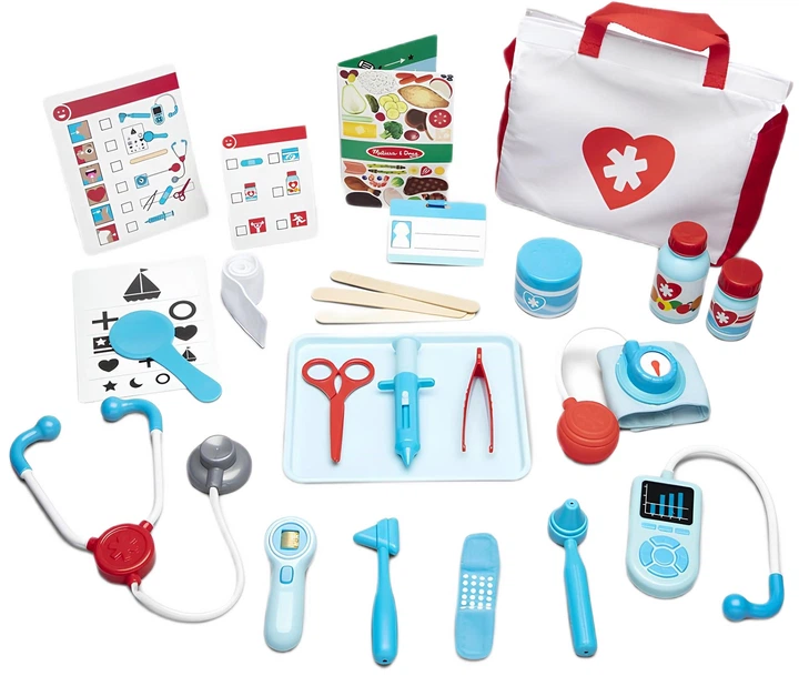 Ігровий набір Melissa and Doug Лікар допоможе малюкам перевтілитися в турботливих лікарів та провести справжній прийом. У наборі — 25 реалістичних аксесуарів, які дозволяють перевіряти температуру, слух, зір, тиск, серцебиття й багато іншого. У комплекті: стетоскоп; шприц; отоскоп; тонометр; ножиці; пінцет; термометр; молоточок для перевірки рефлексів; баночки для «ліків»; бинти; бейджик, як у справжнього медика. Також є багаторазові картки з завданнями та навіть міні-журнал для пацієнтів у «залі очікування». Всі елементи зручно зберігаються у сумці — тож набір можна легко взяти із собою, щоб «відвідати пацієнтів на виїзді». Рекомендовано дітям віком від 3-х років.