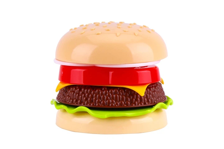 Новинка – дитяча пірамідка, що складається у яскравий соковитий гамбургер. Це іграшка 2 в 1, що поєднує пірамідку та іграшкову їжу. Пірамідка складається з 7 елементів, склавши які отримуємо гамбургер. А тут все згідно з кулінарними правилами: хрумка булочка з кунжутом, соковита котлета, свіжий листок салату та помідор, класичний сир, запашна цибуля. Всі елементи мають спеціальні