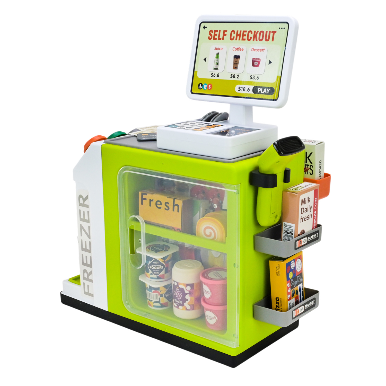 Зустрічай гру, що точно не залишиться без уваги — твій перший власний супермаркет! Натискай кнопки, скануй продукти, рахуй гроші, пакуй покупки та обирай товари з яскравих поличок. Цей набір оживляє улюблений сюжет і дозволяє дітям бути головними у своєму магазині. Весело, реалістично й натхненно — гра, в яку хочеться повертатися знову і знову! Комплектація: Ігрова каса; Сканер;